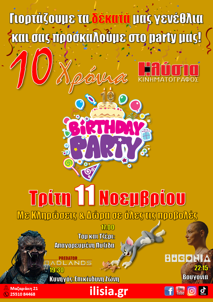 Ο Κινηματογράφος Ηλύσια, τη Τρίτη 11 Νοεμβρίου, κλείνει τον δέκατο χρόνο λειτουργίας του και σας προσκαλεί στο Party Γενεθλίων του.