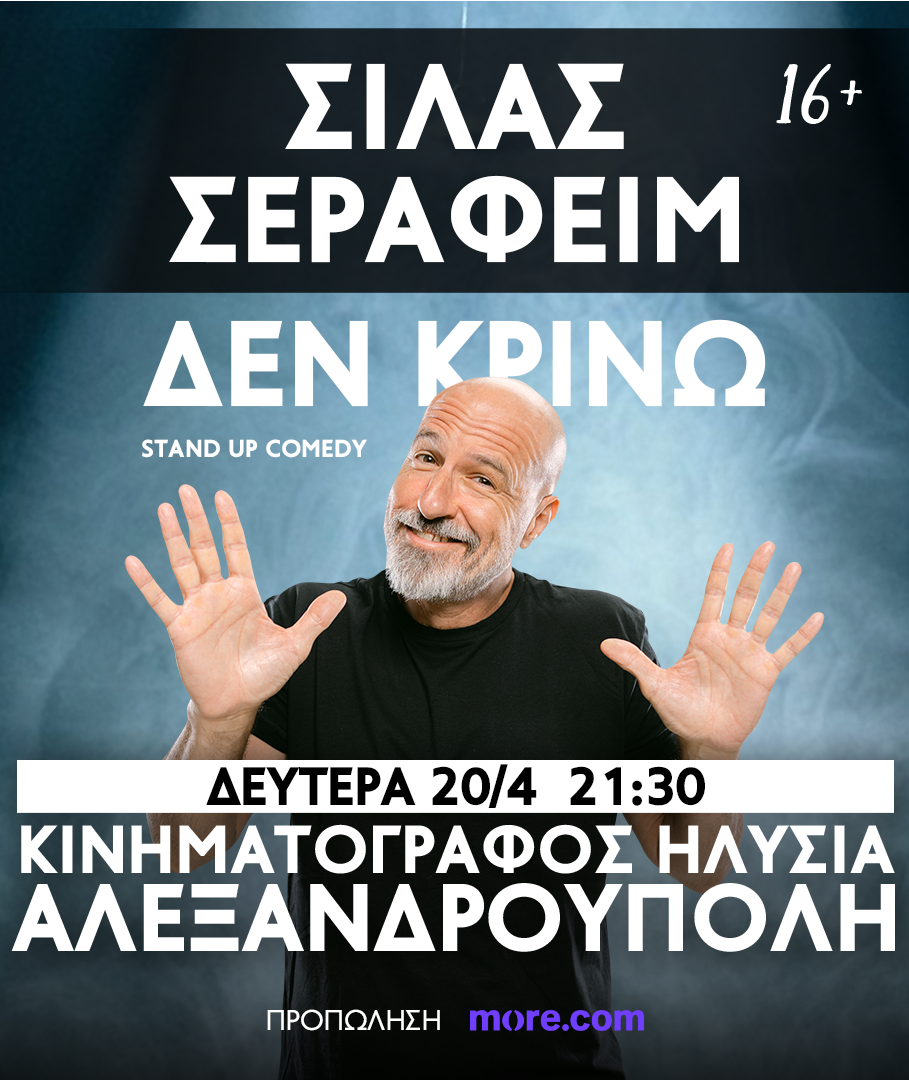 Το μακρινό 1994 συνεστήθη η πρώτη ομάδα stand-up comedy από την αείμνηστη Λουκία Ρικάκη. Ο Σίλας Σεραφείμ ήταν ο πρώτος κωμικός, του πρώτου line up, της πρώτης παράστασης stand-up comedy που έγινε ποτέ στην Ελλάδα. Έκτοτε και μετά από 31 χρόνια «στανταπικής» παρουσίας, είναι πάλι εδώ με τη νέα του παράσταση με τίτλο «ΔΕΝ ΚΡΙΝΩ», για να περάσει απ’ τη Λυδία λίθο της σάτιρας και του ορθολογισμού, το Woke, την Διαφορετικότητα και τη Συμπερίληψη, το Cultural Appropriation και το Cancel Culture, την Ισλαμοφοβία και το χιτζάμπ, το Ρεμπέτικο και την Τραπ, την κακοποίηση και τη βία κατά των γυναικών και τη τοξική αρρενωπότητα. Η σάτιρα του χωρίς να κρίνει, καταδεικνύει για μια ακόμη φορά, πως ο εχθρός είναι πάντα ο ανορθολογισμός.