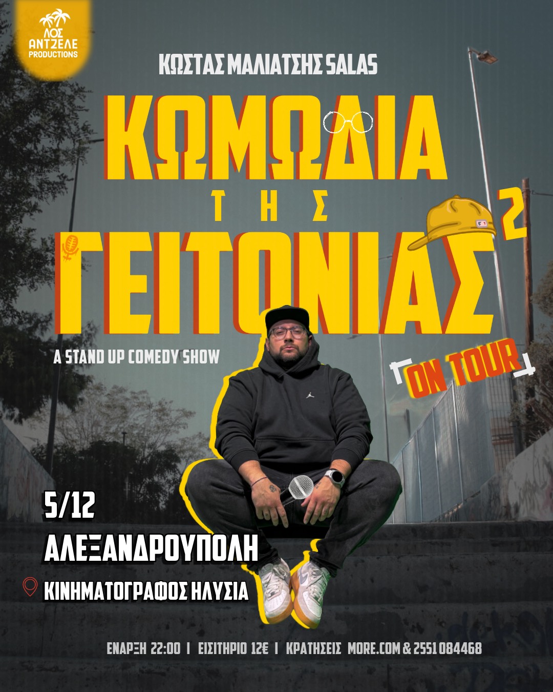Ο Κώστας Μαλιάτσης βγαίνει ξανά στο δρόμο, για να αποδείξει πως η γειτονιά είναι παντού. Η «Κωμωδία της Γειτονιάς» ετοιμάζει βαλίτσες και ταξιδεύει σε όλη την Ελλάδα, με νέα κείμενα, νέες ιστορίες και την ίδια πάντα ματιά που κάνει το κοινό να λέει: «Ρε Μαλιάτση, έχεις βάλει κάμερα στο σπίτι μου;» Ξεκινώντας από τους εκτυπωτές που έχουν αποκτήσει αυτοδιάθεση, μέχρι τις ανθρώπινες σχέσεις που χρειάζονται manual χρήσης, ο Μαλιάτσης σατιρίζει ό,τι πιο μικρό, παράλογο και εκνευριστικά καθημερινό υπάρχει γύρω μας. Και φυσικά, όλα καταλήγουν στο σημείο μηδέν, τη Νίκαια. Τη γειτονιά με τα πιο σκοτεινά σοκάκια, τους ανατριχιαστικά (αστείους) αστικούς μύθους, και τους περαστικούς που σου λένε «φιλαράκι, έχεις κάνα πρόβλημα;» ενώ εσύ απλώς περιμένεις να χτυπήσει το κουδούνι για να ξεκινήσει η τρίτη ώρα «Εμείς και ο Κόσμος».